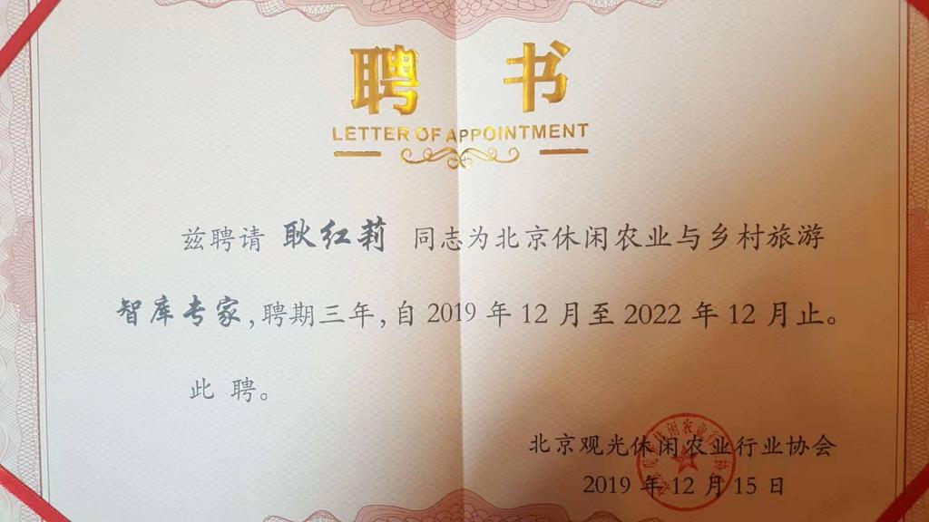 2019年12月15日,2019京郊冬季乡村休闲项目推介暨北京观光休闲农业行业协会成立十五周年年会在北京顺义区意大利农场举行。会上,北京观光休闲农业行业协会聘请best365现代服务管理系旅游管理专业耿红莉副教授为北京休闲农业与乡村旅游智库专家并授予聘书。