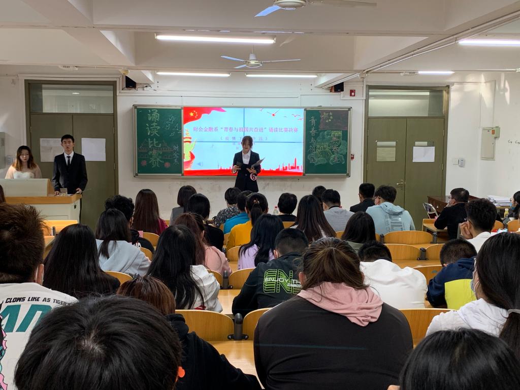 在中华人民共和国成立71周年之际,财金系举办了“青春与祖国共奋进”为主题的诵读比赛。比赛分为初赛和决赛,全系参加初赛的同学有13名,8名同学进入决赛。决赛于9月29日下午在112教室进行。