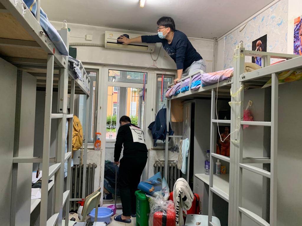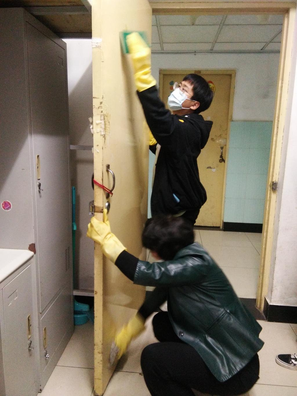开学以来,财金系总支书记和学办主任、辅导员多次到北区(本系)学生宿舍认真了解情况,确认了该宿舍楼学生宿舍的难点在于门、家具和阳台。国庆节前,三位老师选择了一个典型宿舍进行清洗试验,确定了大扫除的标准和需要的清洗用品,并报请后勤服务中心在节日期间准备采购清洗物品。