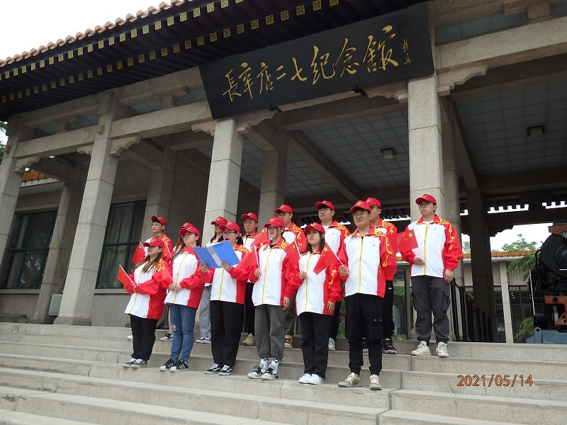 在纪念馆前,旅游1911班团支书张铭珊同学带领同学们面对团旗重温入团誓词,物流1911班班长李浩同学在团旗下作了慷慨激昂的党史诵读,全体团学干部面向纪念馆齐唱《没有共产党就没有新中国》,场面庄严肃穆。