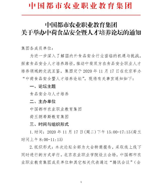 中国都市农业职业教育集团关于举办中荷食品安全暨人才培养论坛的通知