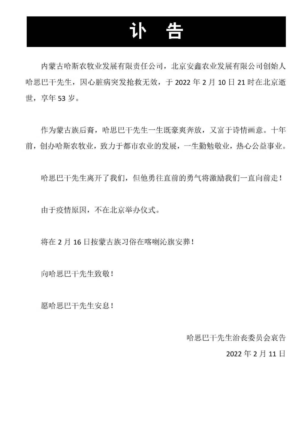 集团副理事长北京安鑫农业发展有限公司创始人哈思巴干先生逝世