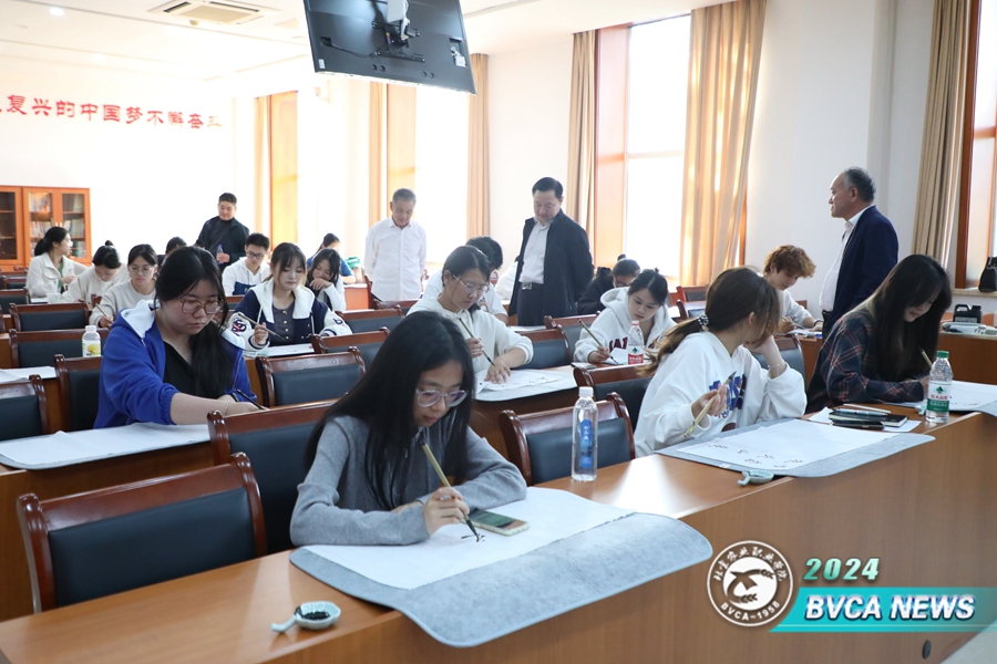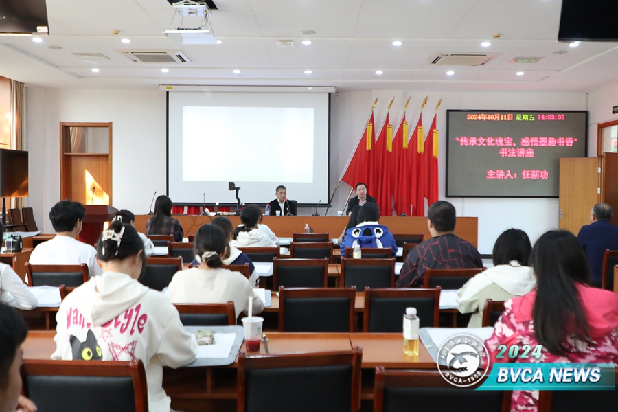 任新功从书法定义出发,介绍了其发展过程、技巧等。理论讲解之后,他与学生互动交流,点评练习情况,并现场创作,传授技巧,赠送作品,寄语学生传承文化。
