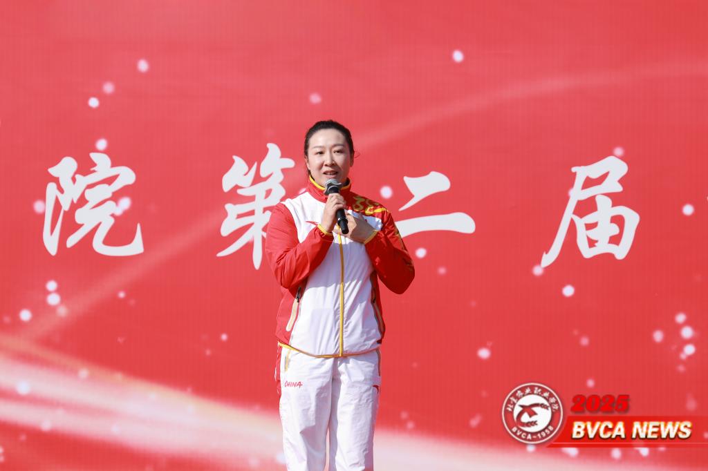 世界冠军徐丽丽到场祝贺并致辞,她结合自己25年的运动经历,鼓励同学们心怀梦想,以汗水和毅力在各自的专业领域书写新篇章,为民族复兴贡献青春力量。