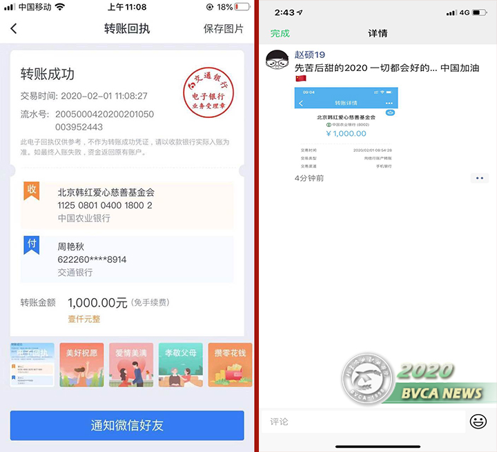中国共产党党员教师周艳秋积极通过微信朋友圈开展疫情防护相关宣传,积极宣传并参与了爱心慈善捐赠活动,与会展1811班班长赵硕分别向北京韩红爱心慈善基金会捐款1000元,为抗击新型冠状病毒感染的肺炎疫情阻击防控工作贡献了自己的绵薄之力。此外,贯通会展16班班长李莹等同学也通过其他网络渠道也开展了为疫区捐款献爱心行动。