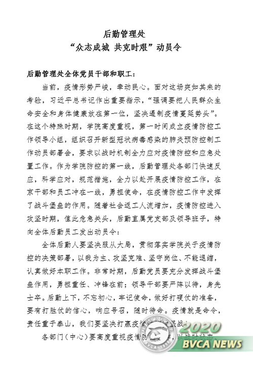 为进一步发挥后勤直属党支部战斗堡垒作用,发挥党员旗帜作用,冲在一线把群众带动起来、凝聚起来、组织起来,全面构筑联防联控、群防群治的严密防线,守护师生幸福安康,后勤直属党支部于防控时期成立了疫情防控党员突击队,并向后勤全体党员发出了“众志成城 共克时艰”动员令。