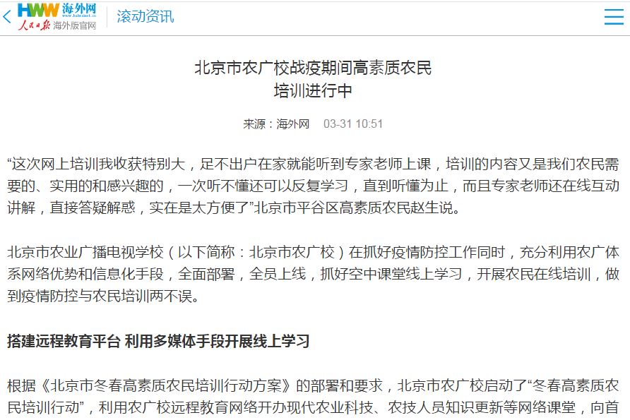 3月31日人民日报海外版:北京市农广校战疫期间高素质农民培训进行中