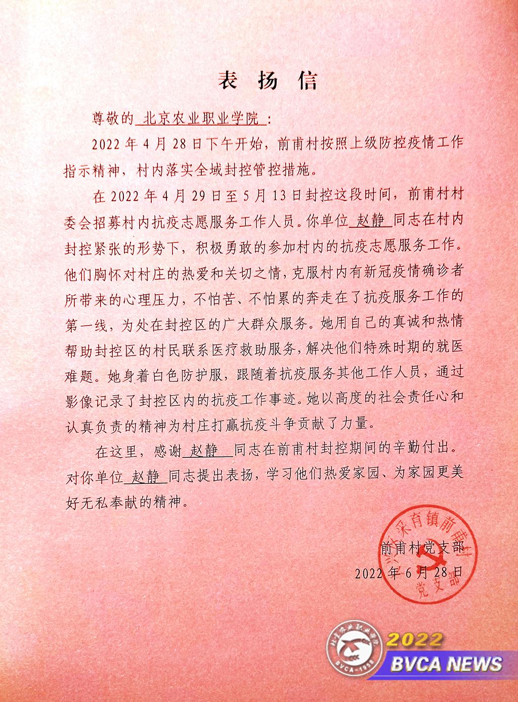 近日,学院收到来自大兴区采育镇前甫村党支部发来的表扬信,对best365村务管理专业20107班赵静同学积极响应村委号召,主动请缨,积极配合社区居委干部共同抗击疫情的事迹进行表扬。