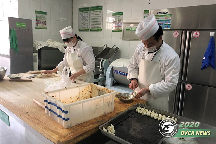 为筑牢疫情防控线,保证学院留校学生和在岗职工能够安全进餐厅,吃上放心餐,党员突击队饮食保障突击组的17名队员们付出了艰辛的努力。因为疫情,外地员工返京返岗受限,原本大年初二进行的换岗只能延期,17名队员自放假坚守至今。随着防控要求升级,餐食加工和供应人员实行封闭式管理,一律不能离开学校。12名后厨餐饮保障人员与家人分离,驻扎学院。他们克服思乡的情结、忘却劳作的疲惫,坚守在饮食防疫保障一线。