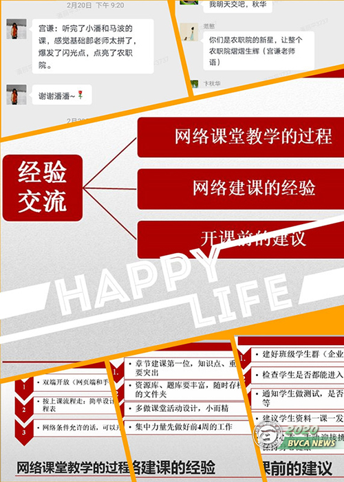 集体的力量是无穷的,每当遇到困难,组里的老师总会互相帮助、集思广益。自学院召集全院任课教师开始培训学习“一平三端”线上教学工作,不过短短2周的时间,潘丽平老师已经建设好自己负责的两门课程《高职语文2》和《农村公文写作》,在基础部分享交流会上做了一场题为《教大家如何做好同步课堂》的精彩教学示范。原来,敬业的潘丽平老师在学院集中培训前就早早开始摸索超星平台的建课模式,提前练习软件操作,大胆探索、反复试验,逐渐掌握了平台线上建课的方法和技巧,建课进程渐入佳境。线上教学中,潘丽平老师针对不同课程和授课对象,采取有针对性的课程内容设计与授课手段,利用同步课堂讲解重点知识,利用企业微信班课群开展学习互动,利用企业微信会议进行习题讲解,多途径调动学生的学习积极性。王瑞玲老师是语文组资深年长的老师,本次课程筹备她是较早完成录课的老师之一,工作之余,王老师乐于指导其他年轻老师,热心协助完成录课建课等工作。通过全体语文教师的勤勉、互助,语文教研室
