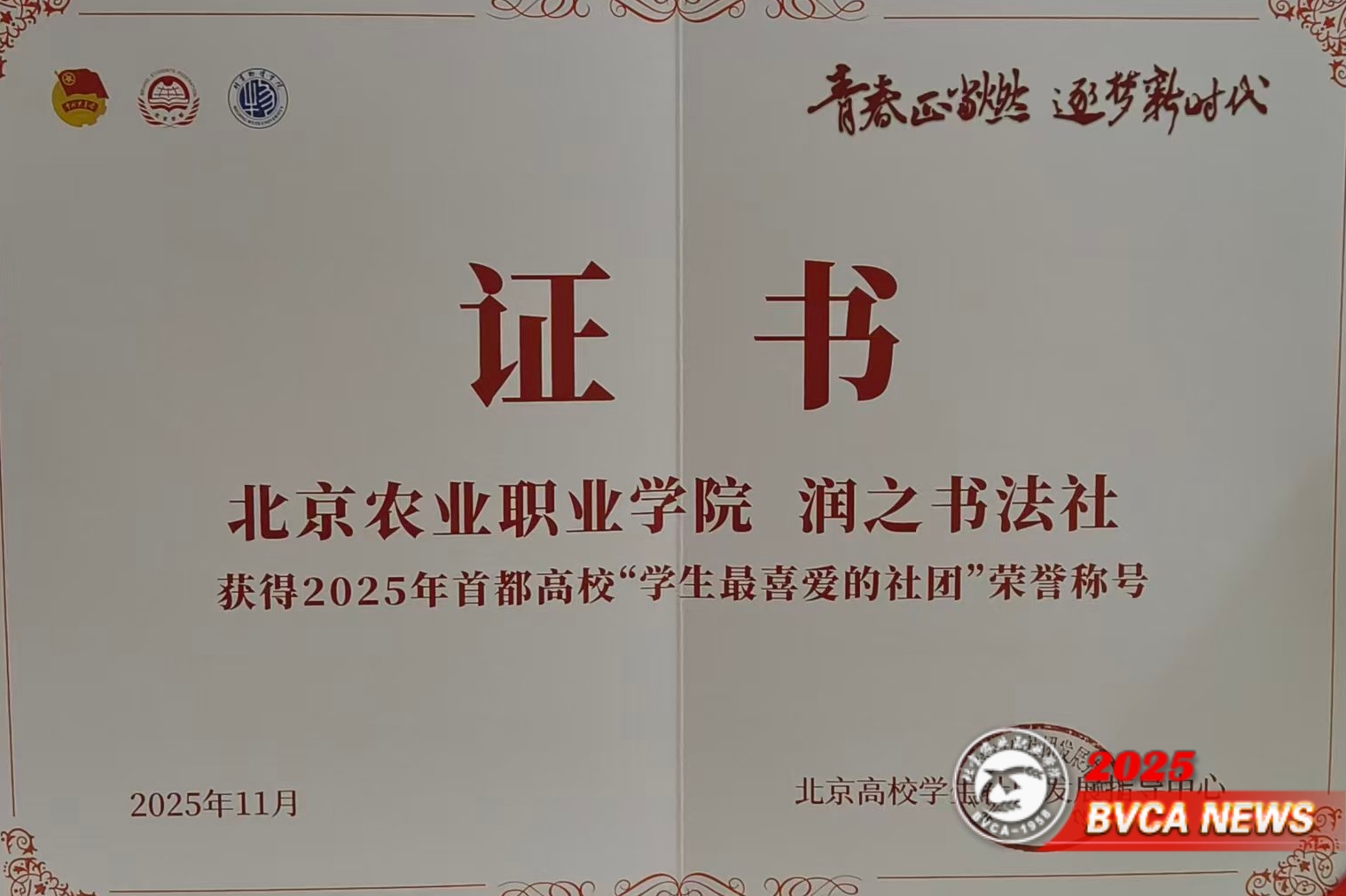 喜报!学校润之书法社荣获2025年首都高校“学生最喜爱的社团”