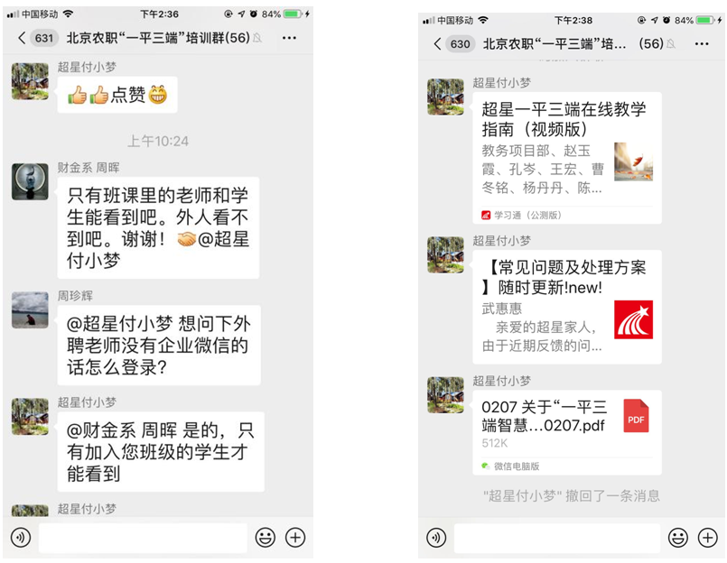 首批培训教师答疑结束后,第二批、面向承担2019-2020学年第二学期教学任务的全体教师的培训通知即刻下发。截至发稿时,共有459名校内外任课教师、教学管理人员加入培训群,340余人开始学习。12日上午将组织第二批培训教师线上答疑工作。