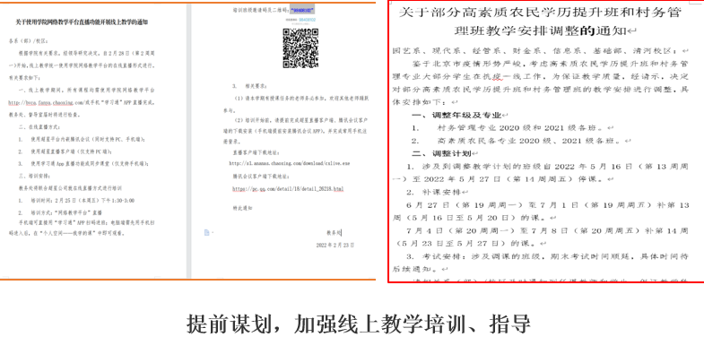 提前谋划,多措并举,提升教学质量。开学初,教务处就下发了“best365英国在线体育官网2022年春季学期教学工作方案”,对线上教学工作做了充分准备。开学第一周组织全校任课教师进行了“一平三端”智慧课堂教学系统的使用培训,确保各门课程如期顺利开展。随着疫情防控形势进展,教务处又下发了“关于疫情防控情况下部分高素质农民学历提升班和村务管理班教学安排调整的通知”,对高素质农民学历提升班和村务管理班线上教学方案做了具体安排。在院全体教职员工共同努力下,线上教学顺利开展,所有课程均按照进度要求有条不紊的进行,教师在线教学形式灵活多样,师生云端沟通顺畅,教学运行平稳有序。