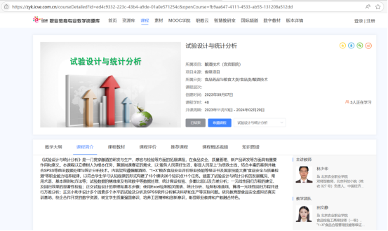 建设了与教材配套的网络课程,助力教学创新。与教材配套的“试验设计与统计分析”课程资源通过学银在线开放,被全国同类院校师生广泛使用。“试验设计与统计分析”是中国白酒技艺传承与数智创新教学资源库(省级资源库)建设课程,课程资源持续更新中。
