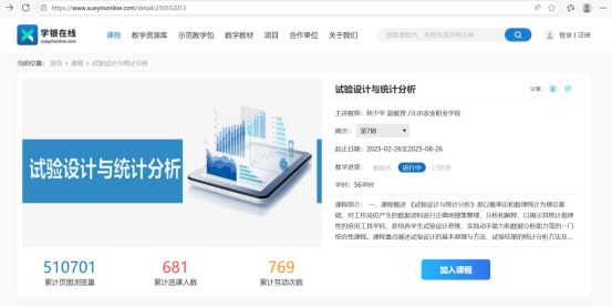 “试验设计与统计分析”学银在线链接网址:https://www.xueyinonline.com/detail/250552013
