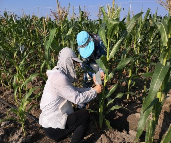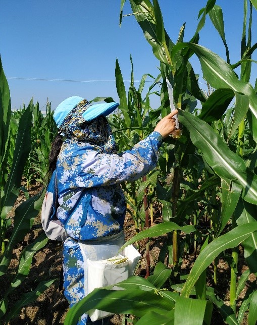 韩振芹、邹原东老师及时观察菜用玉米种植田生长及抽雄情况,调查玉米混杂退化现象,制定授粉计划。并于第二天开始对种植田玉米进行优良株系的选择、淘汰,同时分拨分批进行套袋及人工辅助授粉。因种植面积较大,为避免错过最佳授粉期,保证授粉质量、提高安全性及纯度、降低混杂率,采取分时间、分品种、分地块进行授粉。在授粉的同时进行相关品种材料的田间长势、抽穗期等基础数据的调查工作。为提高自交系后代纯度,优化子代品种特性,按照区域在授粉后及时进行定点筛查和选优,工作量之大前所未有。期间,遇到技术难题通过企业微信及时和园艺系南繁育种团队进行沟通,将相关情况告知大家,集各位专家智慧保证工作的顺利开展