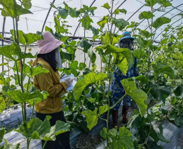 瓜棚有棚膜覆盖,太阳直晒后棚内温度较高,棚内蚊虫也较多,各位老师在做好防护的情况下,只能忍受汗水湿透衣服,几个小时下来衣服已经能拧出水来。