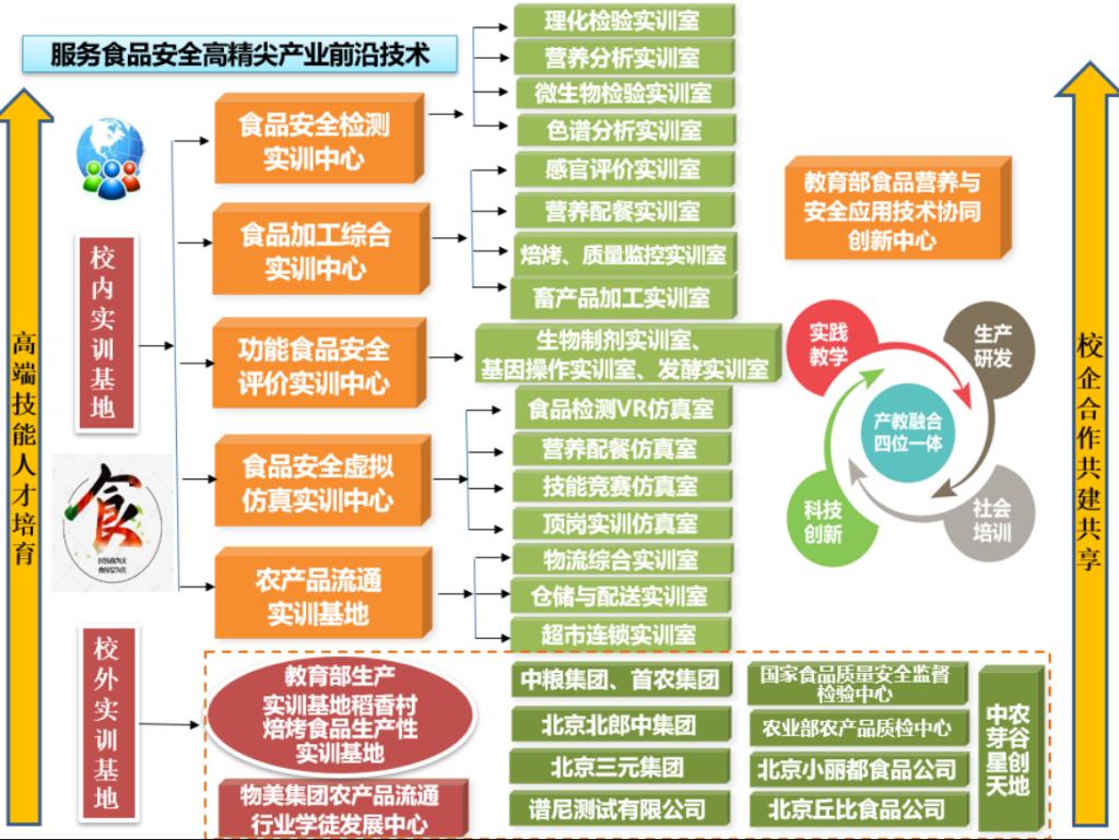 专业群以产教融合、服务行业企业技术需求为导向,建成集教学、培训、研发、应用于一体的校内外共享实训基地。校内实训基地总面积约6000平方米,资产总值约5900万元,包括食品安全检测实训中心、教育部食品营养与安全应用技术协同创新中心、食品加工综合实训中心,食品安全虚拟仿真实训中心,功能食品安全评价中心、农产品流通校内实训基地,建设色谱分析、虚拟仿真、营养配餐、感官评价、仓储等实训室26个。配置高效液相色谱仪、气质联用仪等大型高端设备,开发VR 6套及虚拟仿真20多套;与校外实训基地紧密合作,拥有教育部稻香村焙烤食品实训基地,教育部现代学徒制项目“农产品流通行业学徒培训中心”,与中粮集团、北京物美集团等50余家大型企业开展实习实训、技术研发,形成支撑食品安全专业群实践育人产教融合基地,成为现代学徒制中缔结校企命运共同体的主要抓手,探索以评聘制度改革实现校企人才双向流动,为教育部“1+X”证书试点工作储备了场所、人员、设备等优质资源。