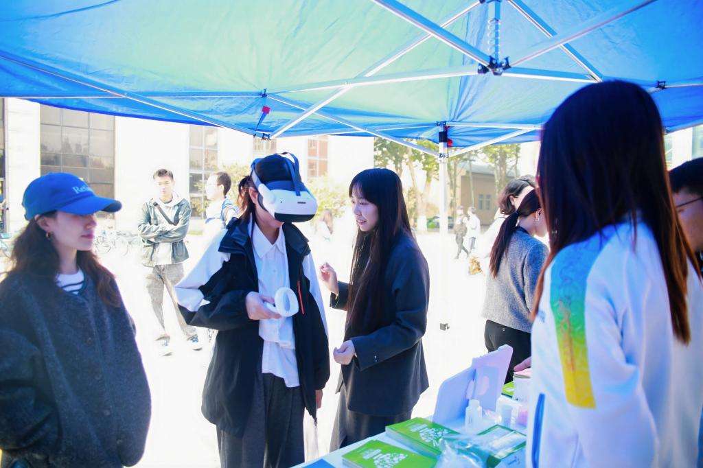 讲座后,师生移步广场参与互动体验。VR设备、快速检测等科普摊位让大家在动手实践中深化理解。生物技术党支部还展示了手工唇膏、精油手工皂等学生自制产品,体现专业特色与实践成果。
