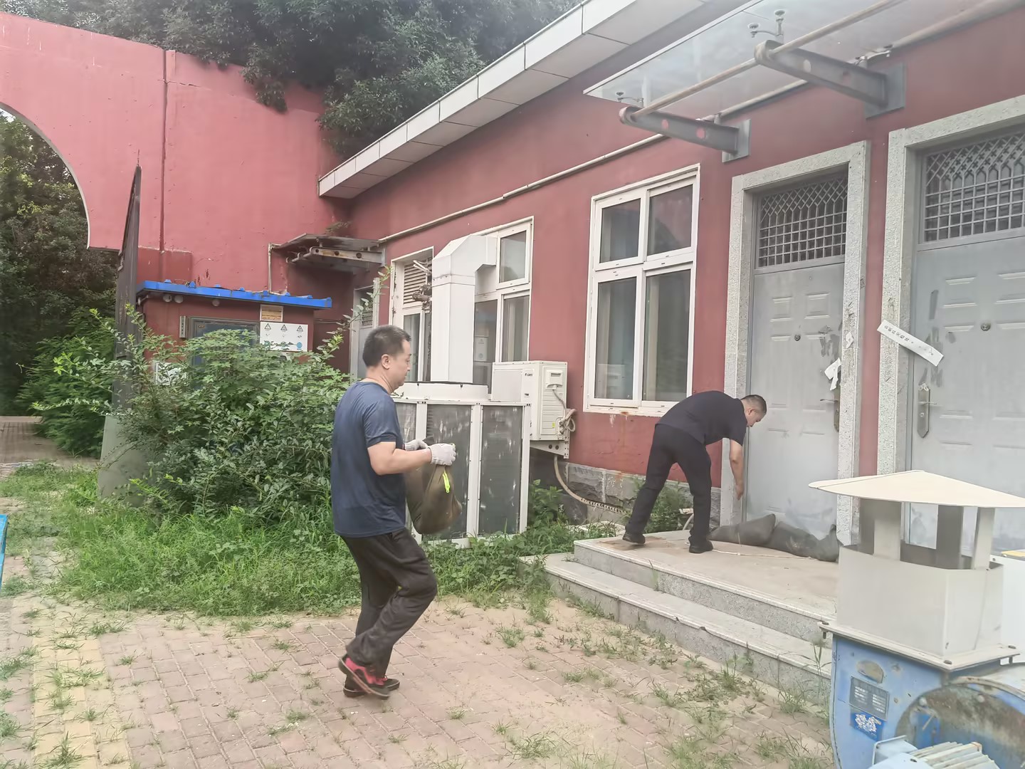 活动当天,支部全体党员来到湖畔实训园实验实训室区域。在前期对实训室及周边环境进行细致全面防汛隐患排查的基础上,支部聚焦防范雨水倒灌风险,将本次活动的重点放在关键部位——实训室门口的防汛沙袋布设上。党员同志们分工协作,默契配合,将预先准备好的防汛沙袋搬运至指定位置,严格按照要求整齐堆放在各实训室入口处,构筑起一道坚实的物理防线,有效提升了重点区域应对突发强降雨的能力。