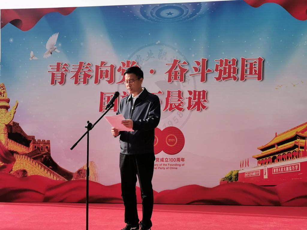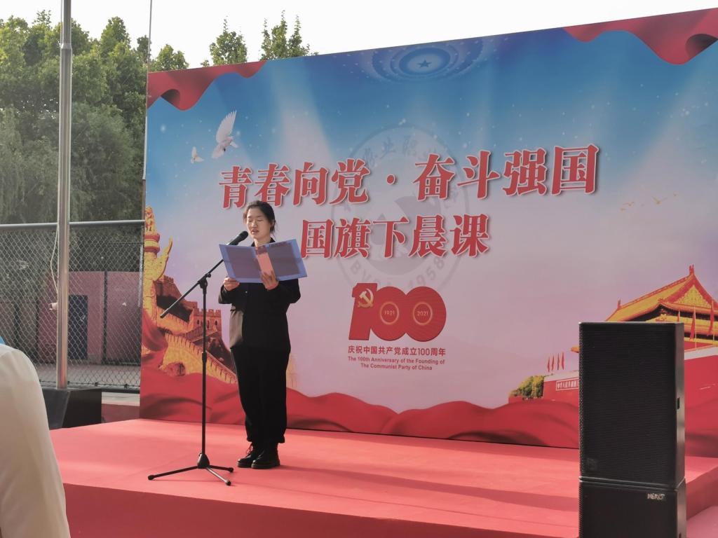 经济管理系辅导员王涵祎老师在国旗下做出讲话。讲述了在党的百年历程中处处可见革命青春的印记。并针对我们现阶段提出在度过极短的少年时光中,不但要珍惜自己的时光,更需要树立正确的世界观、人生观、价值观,不断坚定理想信念,扎实专业知识,将自己人生理想融入到中华民族伟大复兴的宏图中来,不负韶华,勇敢逐梦。倡导我们作为党的后备军共青团员的我们,一定要积极主动走在党史学习的前列,认真、扎实地学好党史,不断坚定青春信仰,一起“青春向党,奋斗强国”。