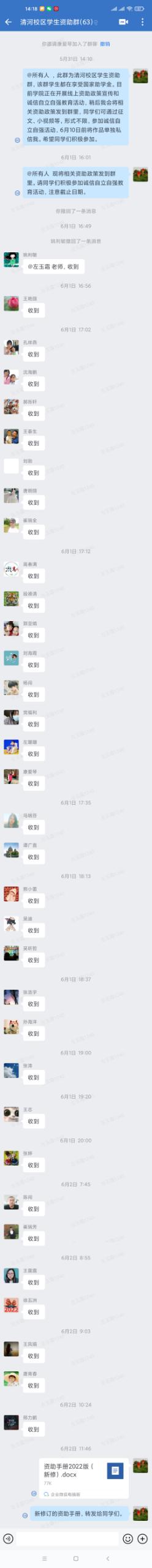 6月1日,清河校区在企业微信群中进行了资助政策宣传和诚信自理自强的教育活动,截止到6月10日清河校区冯杰、李国华、姚利敏、崔瑞芳4名同学通过征文、高春满通过视频形式上交材料。同学们怀着一颗感恩的心一直努力着,在工作中一丝不苟,在生活中尽其所能关心帮助有需要的人,在学习中积极努力做到最好。