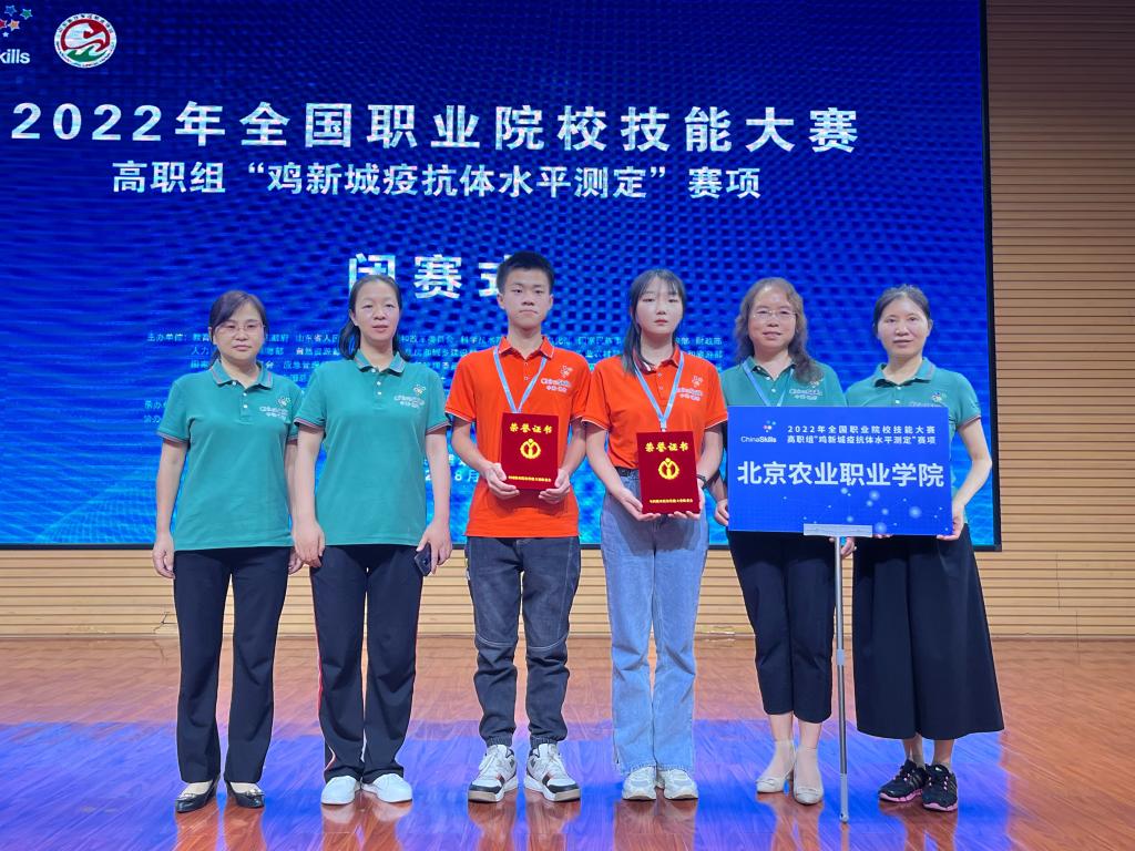 8月17-18日,2022年全国职业院校技能大赛(高职组)“鸡新城疫抗体水平测定”赛项在山东畜牧兽医职业学院举行,由畜牧兽医系主任赵庶吏、副主任周珍辉领队,向双云、雷莉辉两位老师担任指导教师,袁俊豪、杨银琪同学组成的best365英国在线体育官网代表队代表北京市参赛,荣获全国职业院校技能大赛二等奖。
