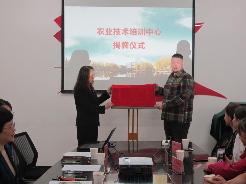 欢迎会上,赵庶吏主任和俄罗斯滨海国立农业技术大学科朱什科·亚历山大老师为两校共建的“农业技术培训中心”揭牌。会后,师生一行参观了学院绿色科技园、畜牧兽医系实训基地和实验室。