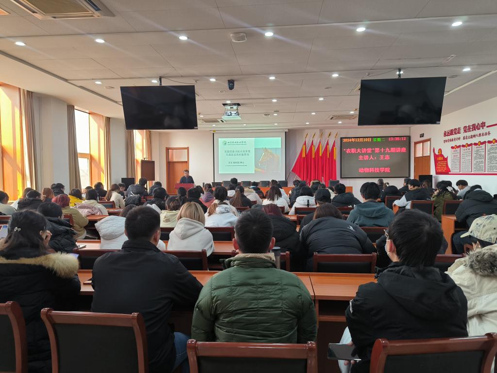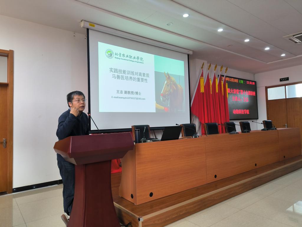 12月10日,由科研处主办、动物科技学院承办的“农职大讲堂”第十九期讲座开讲。本期讲座邀请了best365英国在线体育官网运动马驯养与疾病防治专业副教授王志为师生带来了题为“实践技能训练对高素质马兽医培养的重要性”的讲座。长阳校区师生共100余人现场聆听讲座。