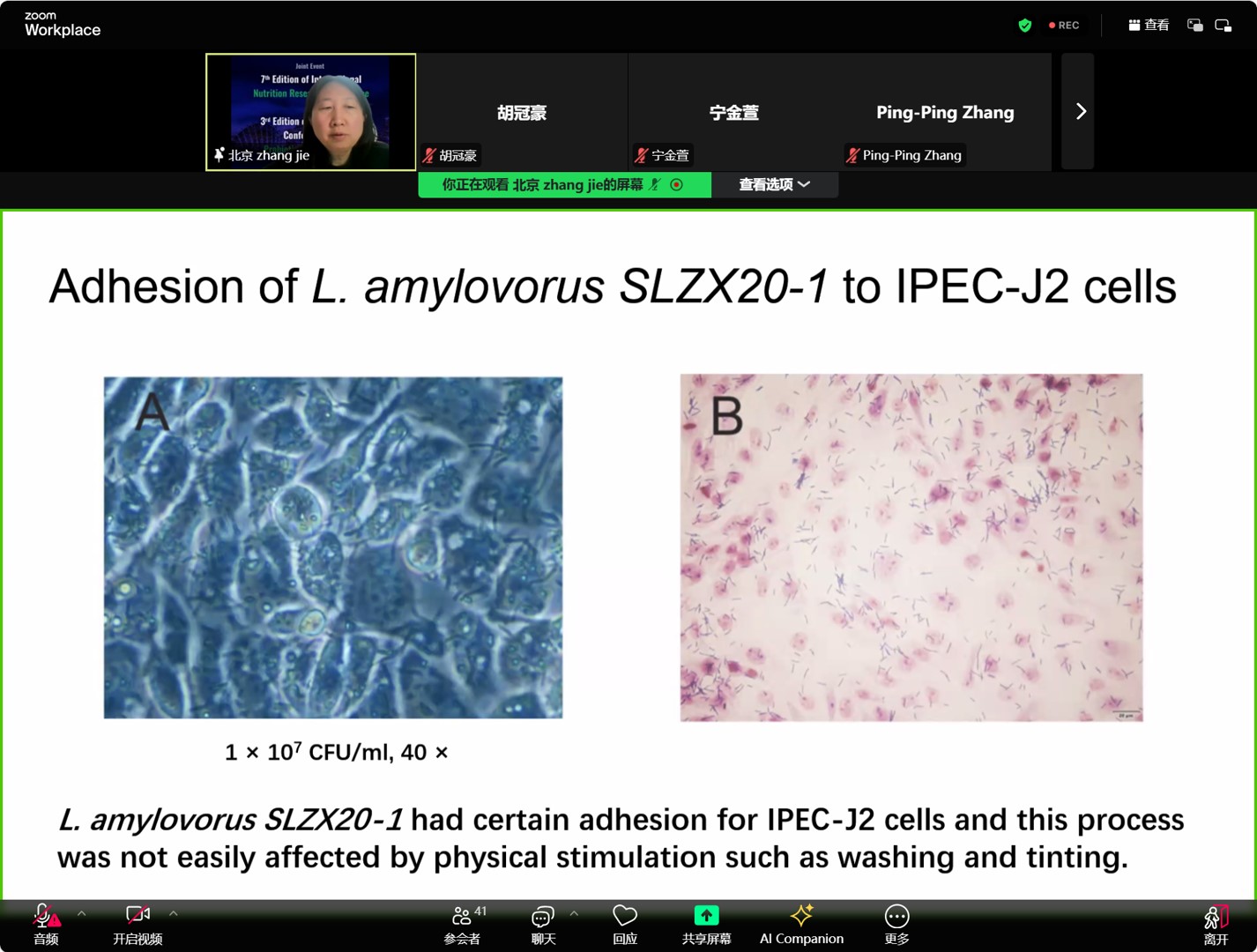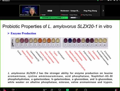 张洁教授在大会上作了题为“A novel probiotic candidate strain, Lactobacillus Amylovorus SLZX20-1, enhances intestinal function through enzyme production and modulation of the gut microbiota”的学术报告,报告系统介绍了一株新型嗜淀粉乳杆菌的最新研究结果。