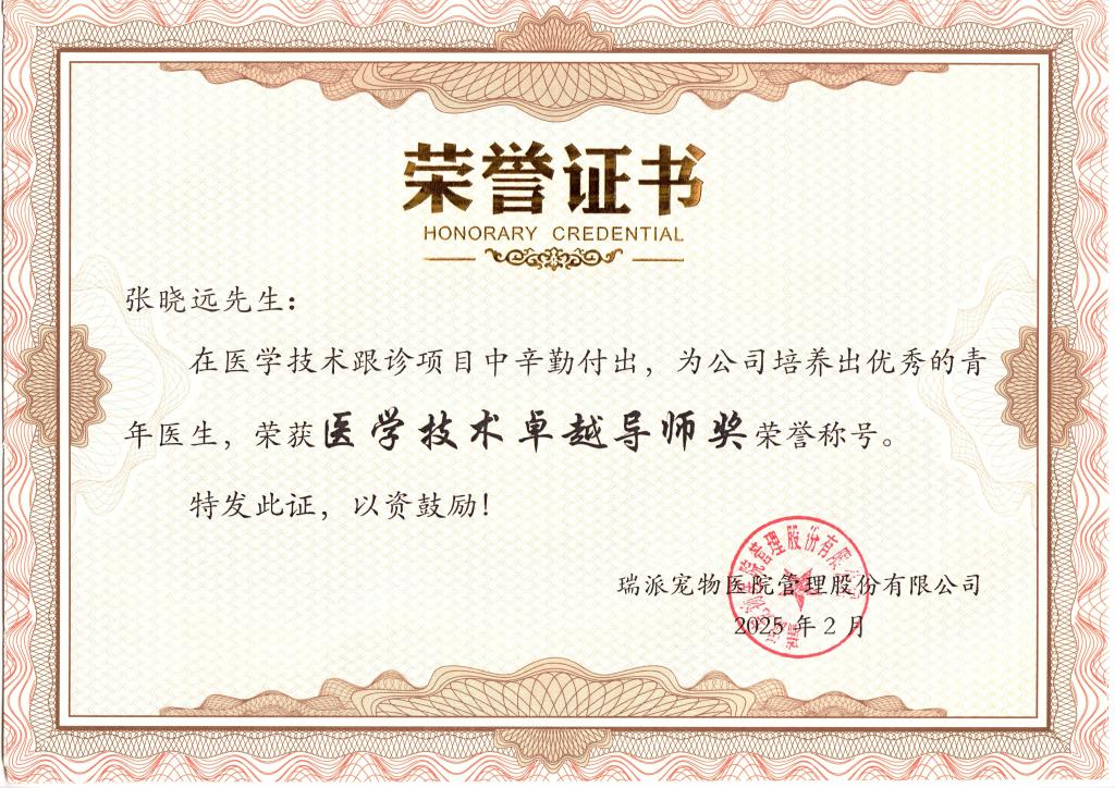 2025年2月18日,动物科技学院张晓远老师受邀参加瑞派宠物医院管理股份有限公司标准化诊疗项目启动会。张晓远老师被聘为“标准化诊疗专家组成员”,参加了50个常见疾病诊疗标准化处方的讨论,承担了其中10种疾病诊疗规范的修订,并在企业年会上荣获“医疗技术卓越导师奖”和“2024年度优秀讲师奖”。