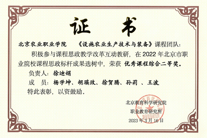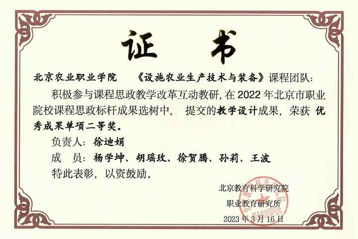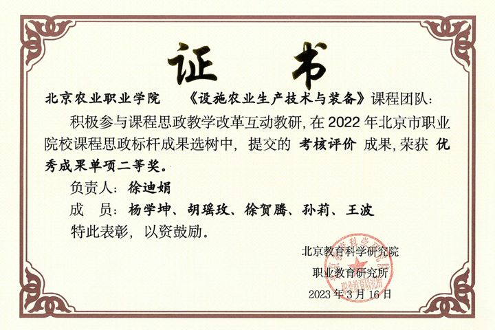 清河校区设施农业与装备专业《设施农业生产技术与装备》教学团队积极参与课程思政教学改革互动教研活动,在2022年北京市职业院校课程思政标杆成果选树中,荣获“教学设计”、“课堂教学”、“考核评价”三个优秀成果单项二等奖和“优秀课程”综合二等奖。在此基础上,教学团队成员进一步开展课程教学研究,积极参加北京教育科学研究院组织的课堂教学诊断活动。