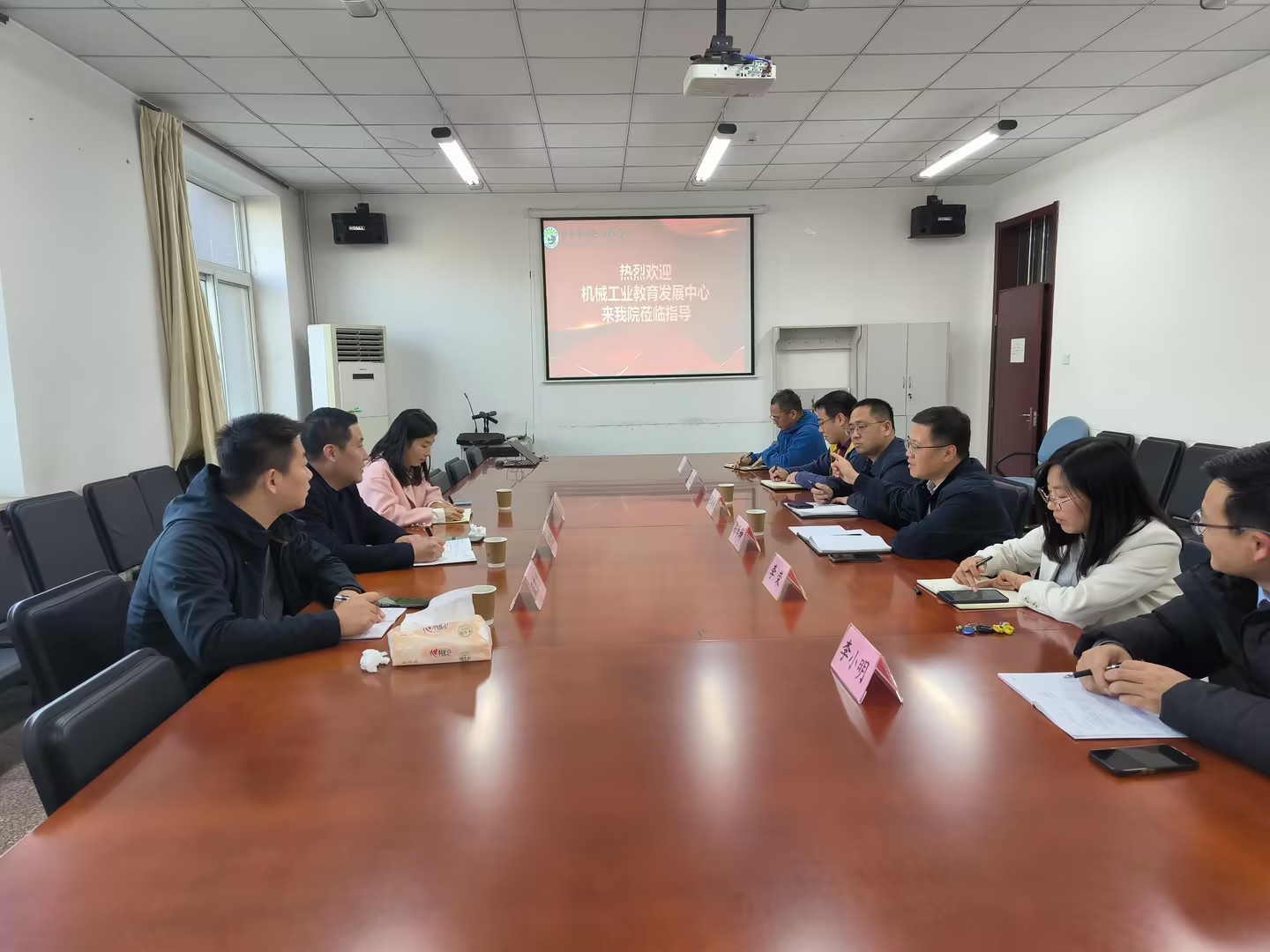 11月25日,机械工业教育发展中心主任助理王志强、中心产教合作处副处长耿东川以及中心所属北京赛育达科教有限责任公司业务经理王争等一行来到智慧农业工程学院进行实地调研与交流。