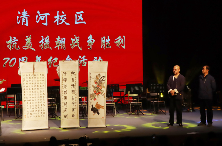 叶克、徐志存、王磊三位老师展示了为纪念抗美援朝而创作的书画作品。叶克老院长用刚劲有力的书法书写了抗美援朝精神。徐志存、王磊两位老师为大家解读创作构思和初衷,笔墨书写红色记忆,丹青挥洒爱国情怀。